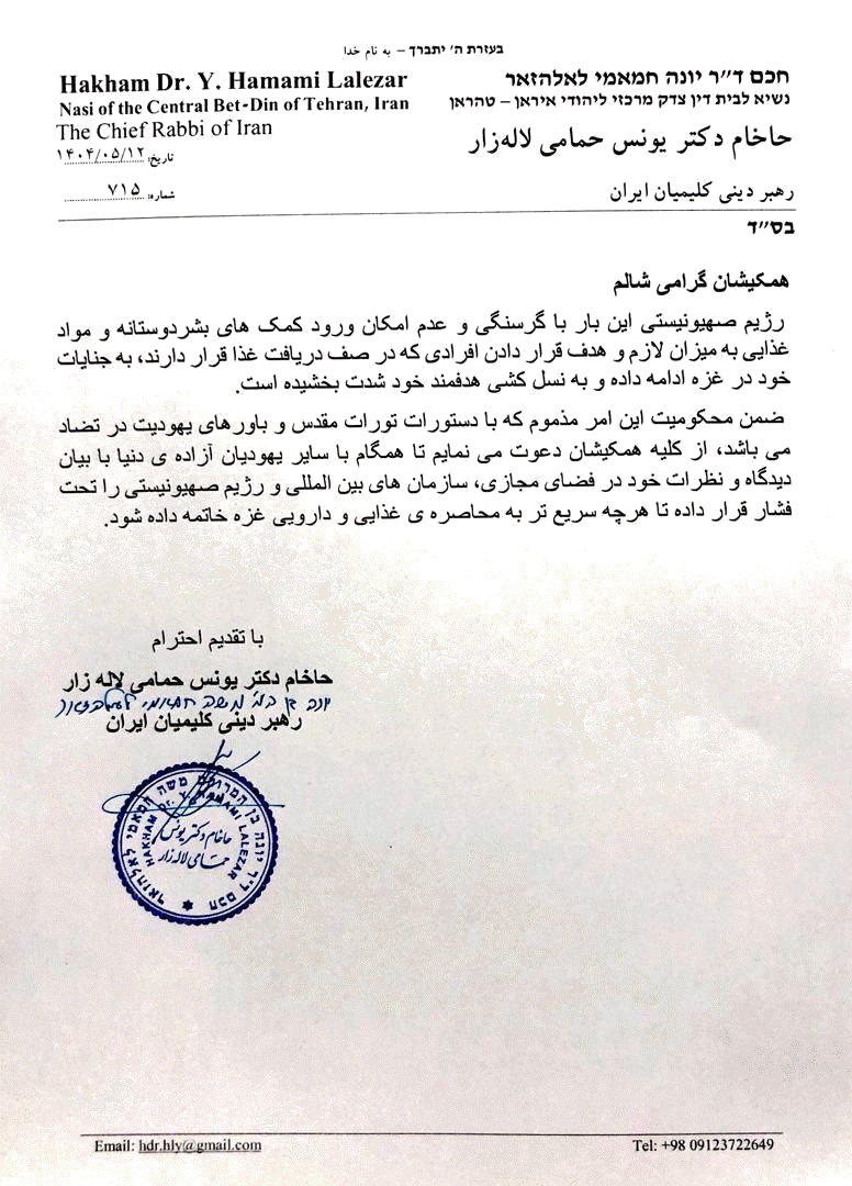 محکومیت ادامه جنایات رژیم صهیونیستی در غزه از سوی جناب حاخام دکتر یونس حمامیلالهزار، رهبر محترم دینی کلیمیان ایران