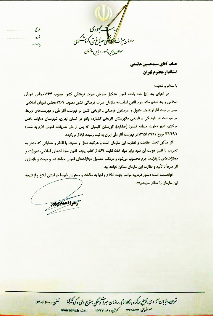 آرامستان تاریخی گیلیارد دماوند به شماره 31691 در تاریخ 21 اسفند 1395توسط سازمان میراث فرهنگی به ثبت آثار ملی ایران رسیده و به زودی مراحل تعیین حدود، دیوارکشی و بازسازی قبور و صیانت از آن با همکاری میراث فرهنگی و انجمن کلیمیان تهران شروع خواهد شد. این گورستان تاریخی با قدمتی باستانی، از اولین مراکز یهودی‌نشین، پس از ورود یهودیان به ایران بوده که آثار متعددی از تمدن اسلامی را نیز در خود جای داده است. 