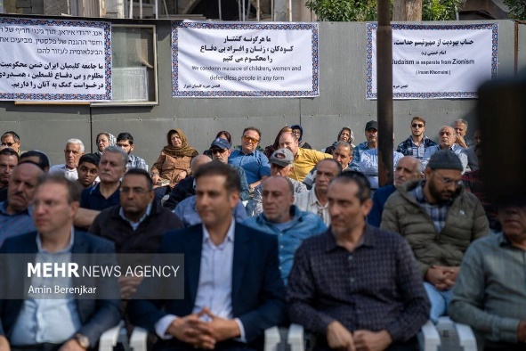 در پلاکارد دیگری که تعدادی از تجمع کنندگان در دست داشتند آمده بود: «ما جامعه ی کلیمیان ایران ضمن محکومیت شدید جنایات رژیم غاصب صهیونیستی علیه مردم مظلوم و بی‌دفاع فلسطین، همدردی خود را با آنان اعلام نموده و از جامعه ی جهانی درخواست کمک به آنان را داریم».