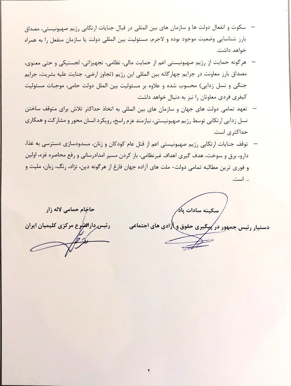 اینجانبان، نمایندگان جوامع ادیان الهی در مجلس شورای اسلامی با محکومیت شدید تمامی جنایات این رژیم به خصوص قتل عام اخیر بیمارستان المعمدانی و کشتارهای کور روزهای اخیر، حمایت خود و جوامع خود را از مردم حق‌جوی فلسطین اعلام می‌نماییم و از جهانیان می‌خواهیم فارغ از منافع و حسابگری‌ها، وظیفه ی انسانی خود که بنیاد امنیت و صلح را تشکیل می‌دهد، به فراموشی نسپارند.