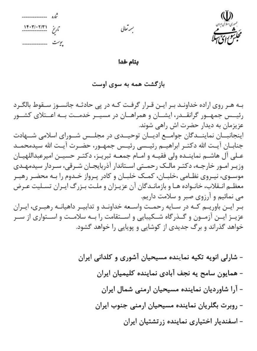 بیانیه نمایندگان جوامع ادیان توحیدی در مجلس شورای اسلامی، در رابطه با حادثه بالگرد رییس جمهور و همراهانشان
