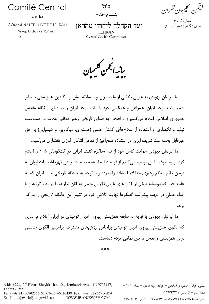 بیانیه انجمن کلیمیان در راستای حمایت از نظام و دولت جمهوری اسلامی