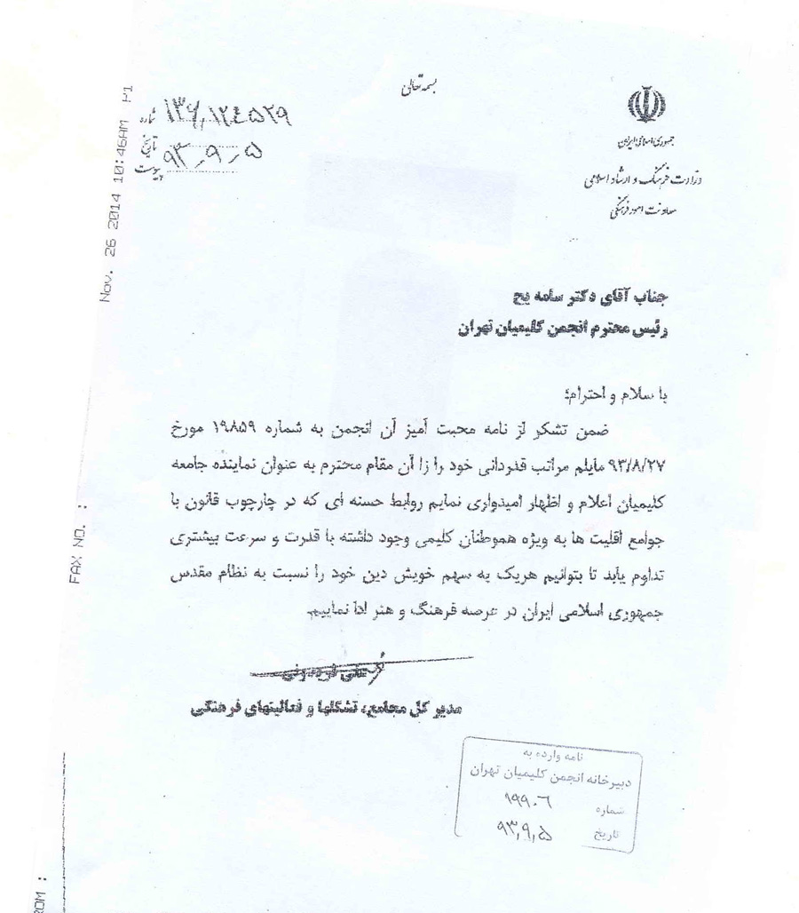 متن تبریک انجمن کلیمیان تهران به مناسبت انتصاب آقای دکتر علی فریدونی به ریاست مجامع و تشکلها و فعالیتهای فرهنگی وزارت فرهنگ و ارشاد اسلامی