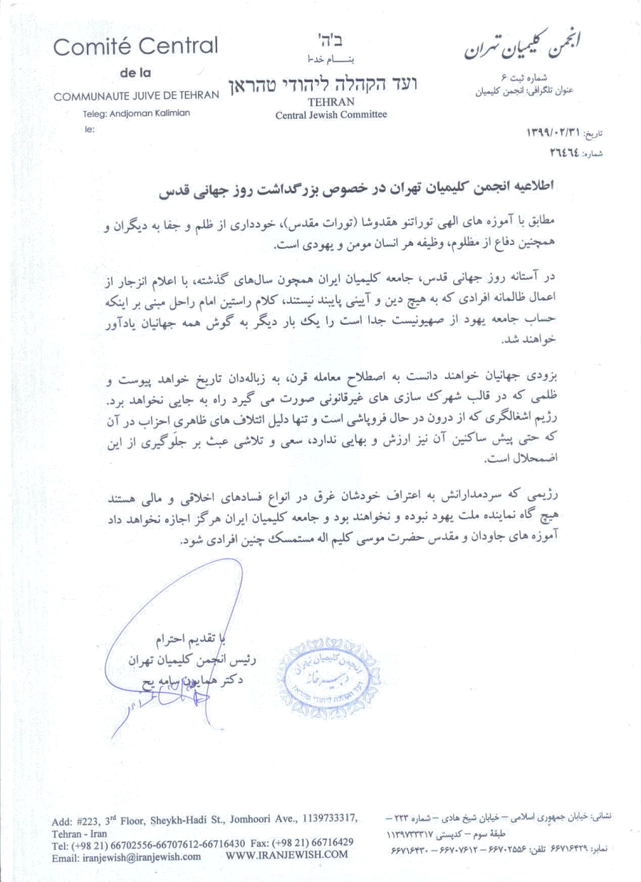 اطلاعیه انجمن کلیمیان در خصوص راهپیمایی روز جهانی قدس