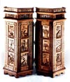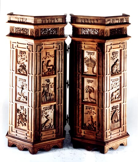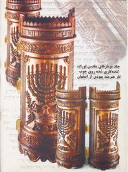 جلد تومارهای مقدس تورات کنده کاری شده روی چوب کار هنرمند یهودی از اصفهان نماد های یهودی – اثر مهندس سلیمان ساسون – ویترای روی بوم – گالری هشت بهشت اصفهان فرش دست بافت ابریشمی کاشان
